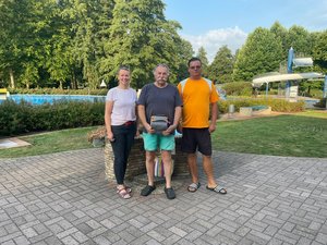 | GemeindeSchwimmmeister Marcel Nerger und Claudia Weber, als Kassenwartin des Fördervereins, freuten sich darüber, den 25.000 Badegast im Waldbad…