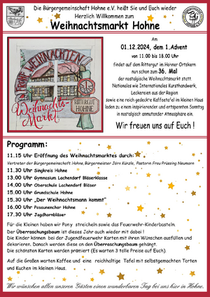 Am 01.12.2024 11:00 Uhr ist es soweit: der 36. Hohner Weihnachtsmarkt geht an den Start